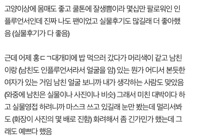 인플루언서 셩셩의 경우 특히 피부가 엄청 깔끔하게 나오고 사진 자체도 일카로 찍은 다음 보정한 거 같은데 다른 인플보다 뛰어난 점이 일단 자연스러워 보인다는 게 최대 장점인듯.