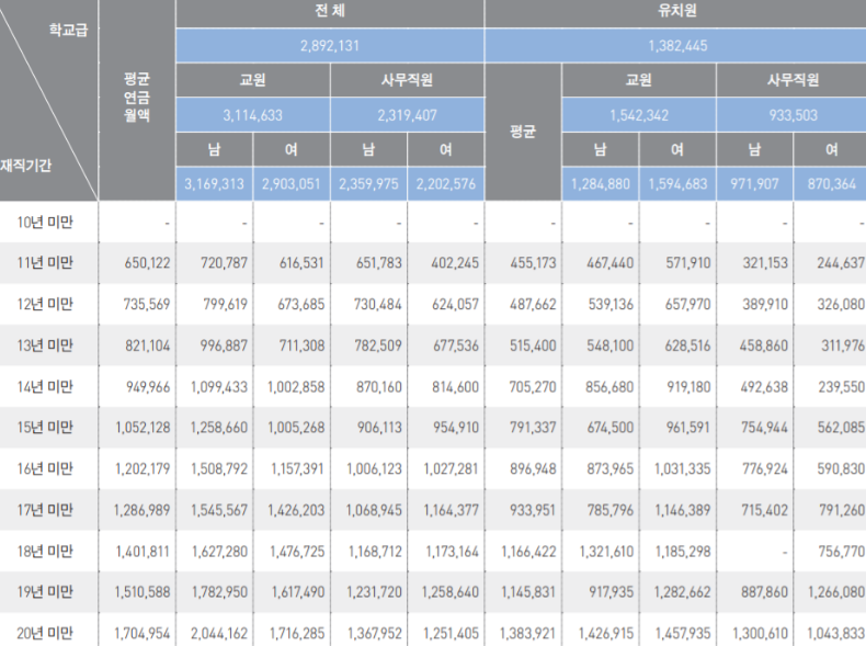 위 자료를 해석하자면 사학연금 지급액수는 초중고대학교의 사학연금 자격 대상자의 연금을 평균적으로 산출한 금액이라는 뜻이다.