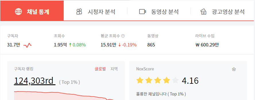 구독자숫자는 상위 1%로 평가되고 있네요.