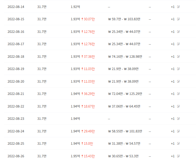 옆집형의 최저 수입은 8월 19일경 21만원~38만원, 최대수입은 8월 21일경 72만원~125만원 입니다.